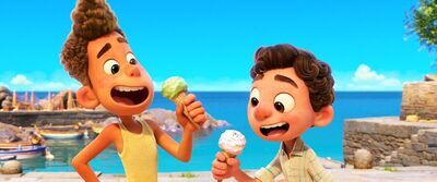 The premise of the film also literally disguises Luca and Alberto as humans amongst the fish hunting Portorosso community. But in a deeper sense, many secrets lurk within Alberto, from the whereabouts of his dad to his general knowledge. He portrays himself to Luca as a world-weary traveler, the kind of friend who swears they’ve been to a place a million times, but has only walked past it. He also tells the impressionable Luca how the stars are actually fish swimming in a vast black ocean, that school is unnecessary, and to ignore his “Bruno” (or the tiny scared voice inside your head). His outsized confidence papers over his clear insecurities, especially as Luca first grows closer to Giulia and later thinks for himself.