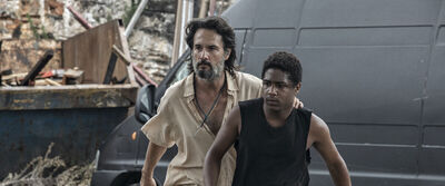 As Luca, the man who runs the junkyard and makes the men’s lives miserable, Rodrigo Santoro is practically unrecognizable. Gone is the heartthrob of “Westworld,” the dashing Castro in the “Che” duo of films, the much-hated Paulo from “Lost,” and the monstrous Xerxes from the “300” graphic novel adaptations. He is shaggily bearded, loose-limbed, quick with a slap and casual with a gun. With the easy narcissism and manipulation of so many oppressors, Luca tells the young men that they owe him for their travel, for their advance payments, for the crummy gruel they eat three times a day, for the rotten mattresses they sleep on, for the gloves they have to wear while handling scrap metal, copper, and rubber in the junkyard. “You’re lucky I keep track of everything,” Luca says with faux concern, and the men need to pay it all off.